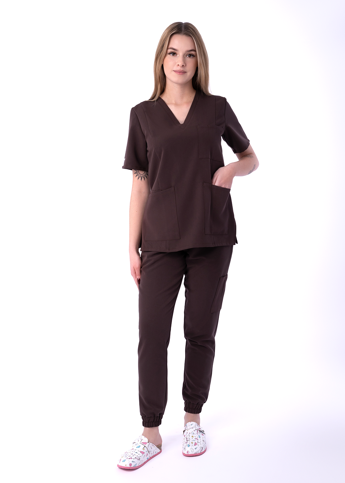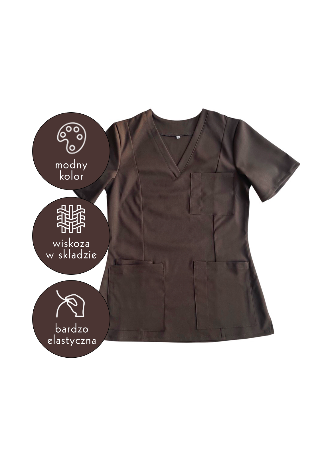 Bluza medyczna damska w modnym kolorze czekoladowym wkładana przez głowę. Fason posiada trzy kieszenie na biodrach (jedna z nich na telefon komórkowy) oraz jedną u góry po lewej stronie. Dzięki pionowym cięciom lepiej dopasowuje się do sylwetki i bardzo ładnie podkreśla talię.